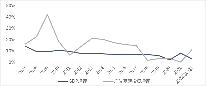 其次,基建投資是我國實施宏觀調(diào)控的重要抓手。基建投資可控性強,可在預(yù)期時間內(nèi)促進經(jīng)濟企穩(wěn)、穩(wěn)定民生就業(yè)、改善市場預(yù)期,是良好的逆周期政策調(diào)節(jié)工具。千禧年以來的經(jīng)濟下行期中,基建投資均起到了熨平周期、穩(wěn)定增長的作用。第一次是2008-2009年,面對全球金融危機,我國推出“四萬億”等財政政策,基建投資同比增速大幅提高至23%、42%,占2009年GDP比例達12.8%,強勢托底經(jīng)濟;第二次是2012-2013年,面對歐債危機等外生沖擊,基建投資增速在2013年大幅回升至21%,疊加制造業(yè)、房地產(chǎn)一同刺激經(jīng)濟復(fù)蘇;第三次是2016年,面對經(jīng)濟下行,基建投資在相對寬松的政策環(huán)境下維持高位,以15.71%的增速穩(wěn)住經(jīng)濟大盤;第四次是2022年前三季度,我國經(jīng)濟增速受疫情沖擊下滑至3%,基建投資再度扛起穩(wěn)增長大旗,同比增速達到11.2%,有力帶動經(jīng)濟回歸正常軌道、確保運行在合理區(qū)間。